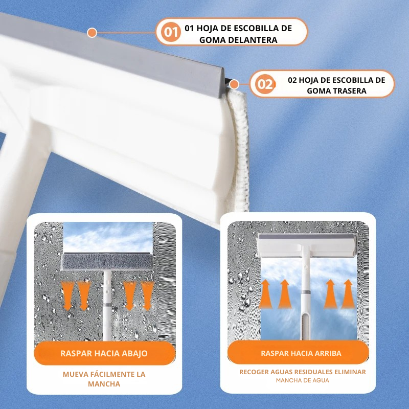 El pulverizador lanza una fina capa de agua o limpiador directamente sobre el cristal. Con el paño de microfibra limpias la suciedad, y con la escobilla de goma TPR secas y dejas la superficie sin marcas ni gotas.